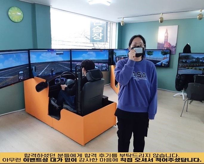 운전학원은 가격이 너무 부담되어 좀 더 저렴한 남부 운전교실을 이용하게 되었는데 처음엔 스크린으로만 연습한다는것이 걱정이 되었습니다. 그래도 많은 합격수기를 보고 2종면허를 따 본 경험도 있기에 침착하게만 하면 될 것이라 생각했습니다. 시험 당일까지 2시간씩 7일간 연습하였고, 실제로 연습장 기계가 더 예민하여 실제 운전할때는 더 조심하게 되고 도움이 되었습니다.