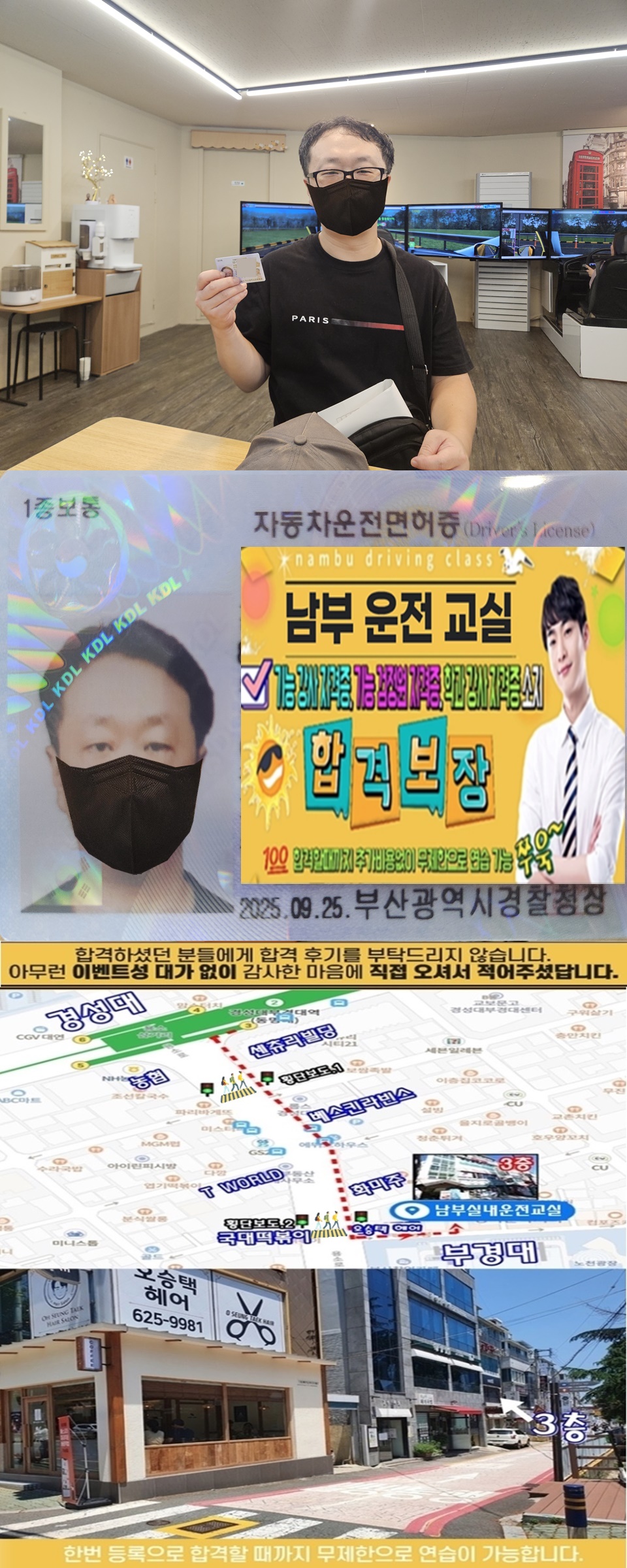 전문학원의 적은 연습량으로 인해 기능에서 바로 떨어진 후 많이 연습하기 위한 곳을 찾다가 합격률이 높은 남부 운전교실을 보게 되었습니다.실내에서 될까 의심반으로 방문했었는데 선생님이 믿음을 주셔서 바로 다음날 부터 연습했어요. 처음 부터 직진, 좌우회전 또한 가르쳐 주시며 전문학원에선 배울수 없는 운전기술을 배울수 있었습니다.많은 연습량과 선생님의 친절하고 핵심적인 설명으로 합격하게 되었습니다. 정말 감사합니다.다른 완전 초보분들도 이곳에서 부담없이 시작하세요.