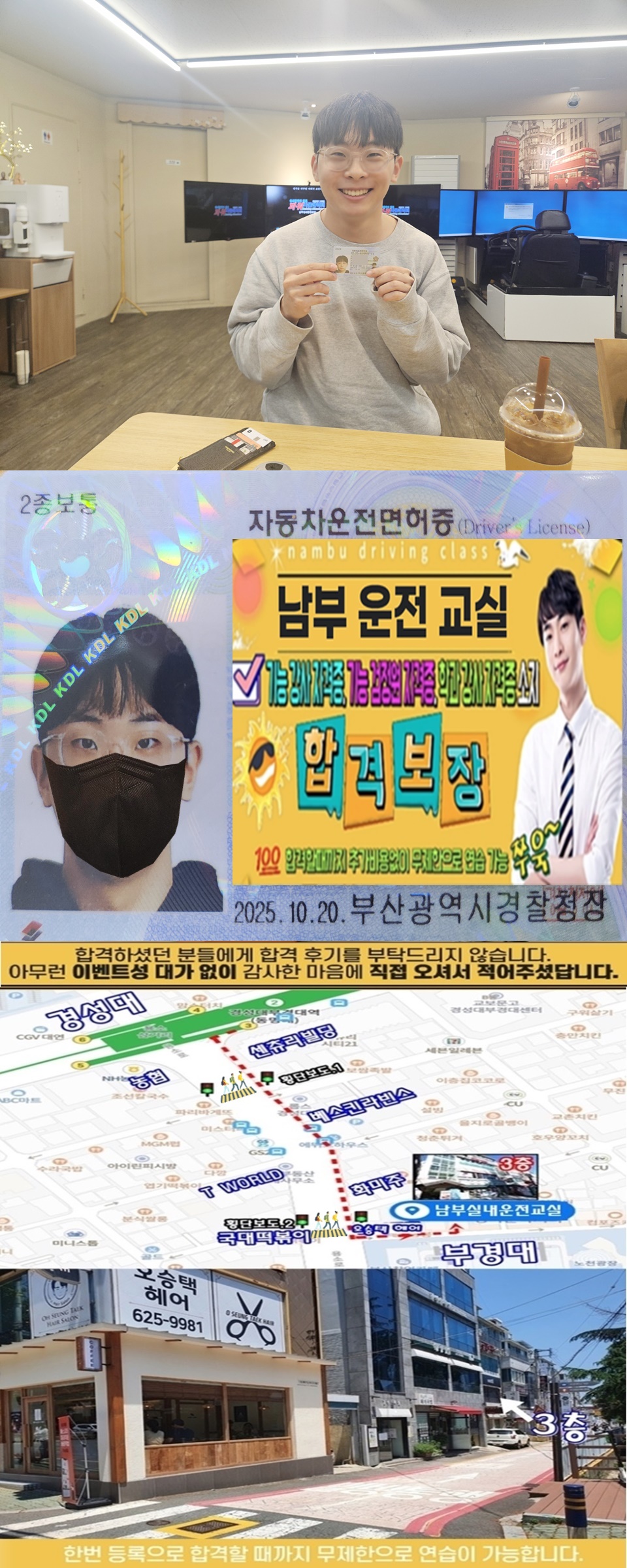 선생님께서 너무 친절하게 잘 가르쳐주셔서 쉽게 합격했습니다! 특히 기능시험은 정말로 가르쳐 주시는대로맍 하시면 돼요. 실제 차량으로 하는게 아니라 걱정하시는 분들도 있을거 같은데 하나도 하실 필요 없습니다! 시뮬레이션이 정말 정교하게 잘 돼있어요, 이 학원 진심으로 강추 드립니다!!