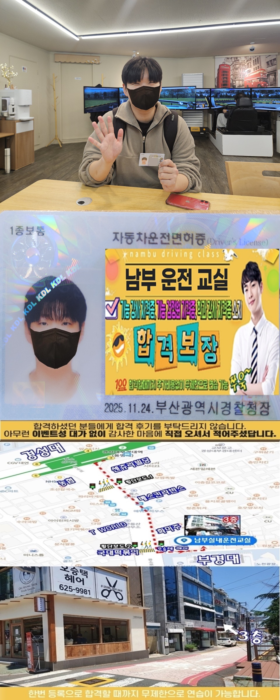 운전면허 취득을 위해 학원 알아보던 중 학교에서 가까운 거리에 실내운전교육장이 있다는 것을 알게 되었어요. 실내운전교육장이라 실제 자동차와 차이가 있을 수 있다고 생각 했지만 가격이 너무 합리적이어서 수강하게 되었습니다. 선생님께서 면허 취득을 위한 계획 세워주시고 잘 가르쳐주셔서 3주 만에 운전면허 취득하게 되었어요. 생각보다 실제 자동차와 차이가 많이 없어서 놀랐고 요즘 운전면허학원 가격이 부담되신다 싶으시면 남부운전교실 정말 추천드립니다.
