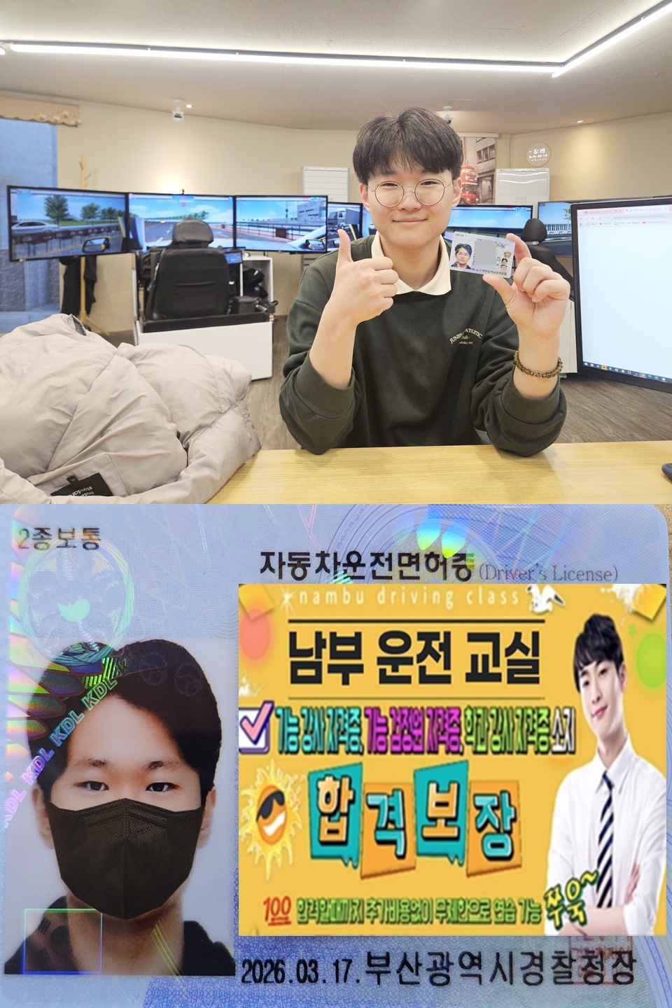 항상 밝은 모습으로 인사해주던 것도 기억에 남고, 올 때마다 편의점에서 사온 마이쭈를 하나씩 건네주던 그 모습도 참 따뜻하게 남아 있습니다 . 그리고 무엇보다 친구 세 분 모두 남부운전교실에서 합격한 게 정말 뿌듯했어요.